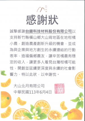 台鎔科技材料股份有限公司以支持新竹縣橫山鄉大山地區在地柑橘小農地方創生的永續連結的行動,讓更多人看見台灣柑橘可能性,開創並延續更深度與永續的社會影響力。