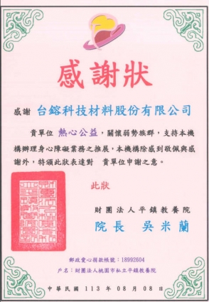 台鎔科技材料與桃科環科大潭工業區聯合廠商協進會共同辦理敦親睦鄰活動,回饋觀音區、新屋區偏僻地區國中、小學共計10所,共計捐贈100萬元。
