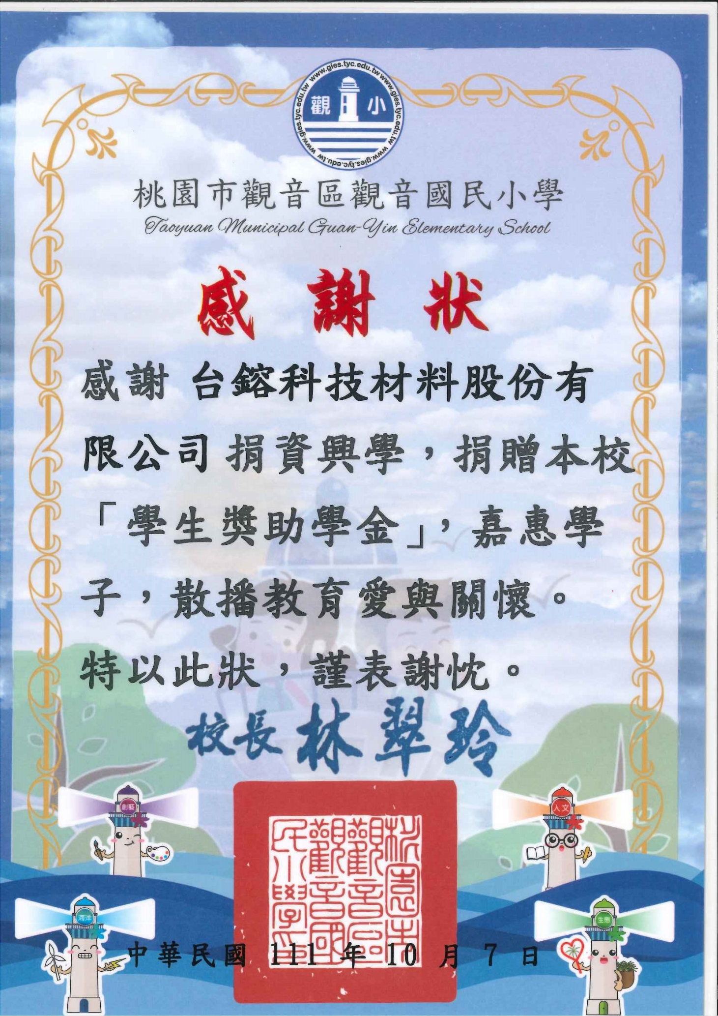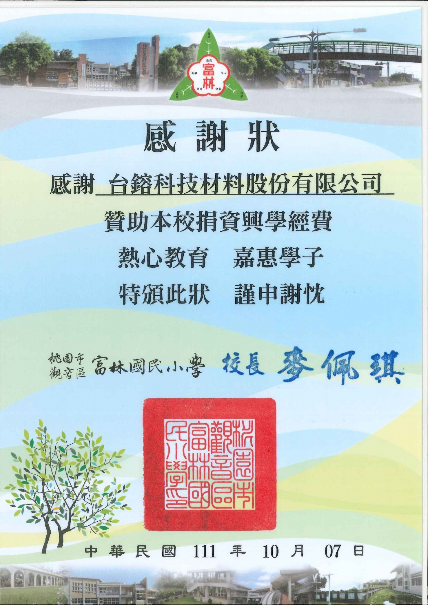 受贈的學校,包括觀音國中、大潭國小、保生國小、觀音國小和富林國小。