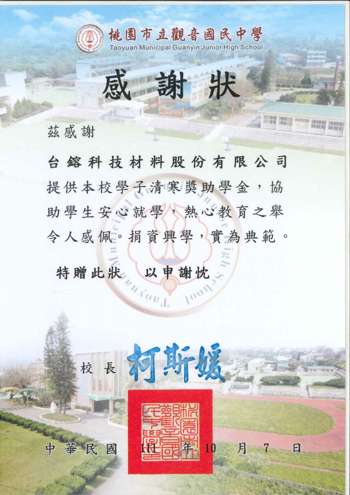 台鎔科技材料與桃科環科大潭工業區聯合廠商協進會共同辦理敦親睦鄰活動,回饋觀音區5所國中、小學,共計捐贈40萬元。